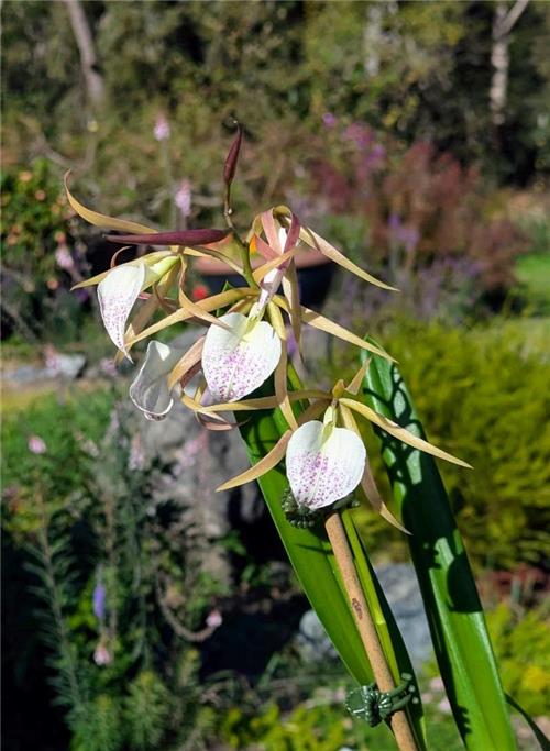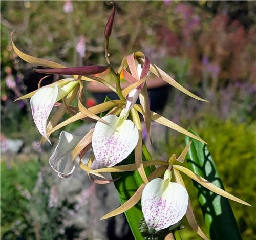 Each flower spike produces 5-10 flowers. The flowers are 2-3" across and 3-4" top to bottom. The narrow petals and sepals are a warm gold color, and the huge white, spade-shaped lip is decorated with purple dots that are concentrated near the tip.