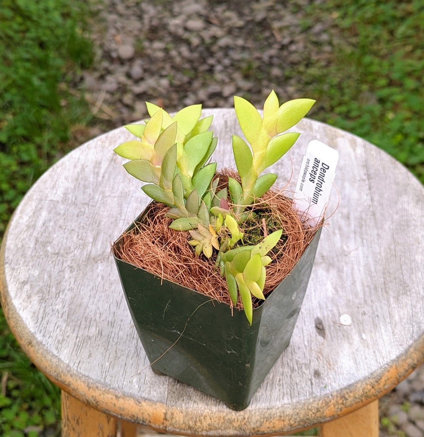 Well-established, near-blooming size plants recently repotted into 3.25” pots. Dendrobium anceps is an interesting epiphytic species native to Southeast Asia, including regions like Thailand, Laos, and Myanmar.