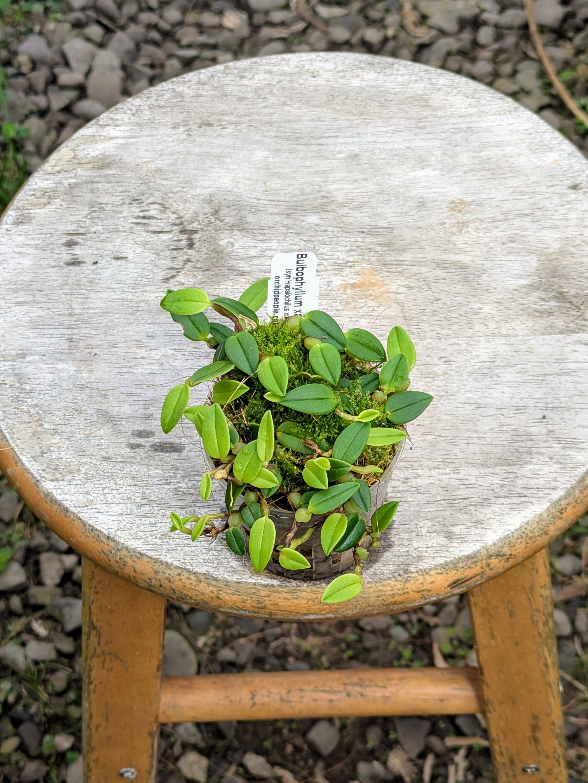 Beautiful flowers are about a 1/2 inch across with mahogany petals that have a crystalline white margin. The lip is bright yellow. Flowers close for the night only to reopen the next morning! Stays very small and forms dense mats.