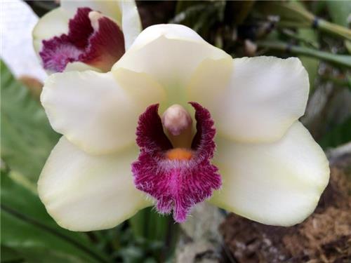 The creamy white flowers are 3" across. The lip is light purple with reddish veins and is covered with fine hairs. And the fragrance is amazing! It is in my top 5 greatest smelling orchids!