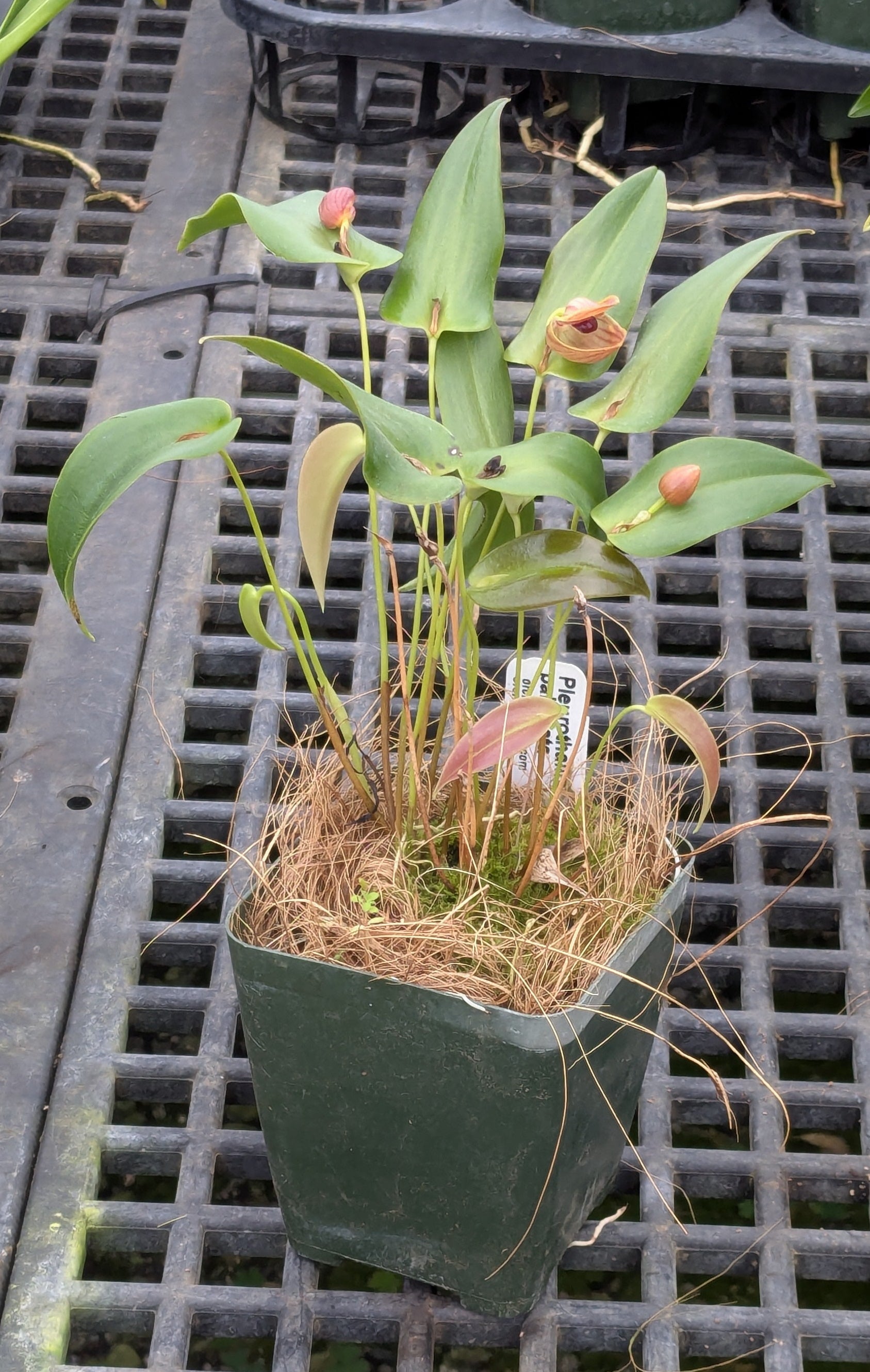 Beautiful heart-shaped leaves that are on the large size for a Pleurothallis. The large flowers, for a Pleurothallis, sit on top of the leaf. Quite a conversation piece! Flowers multiple times a year.